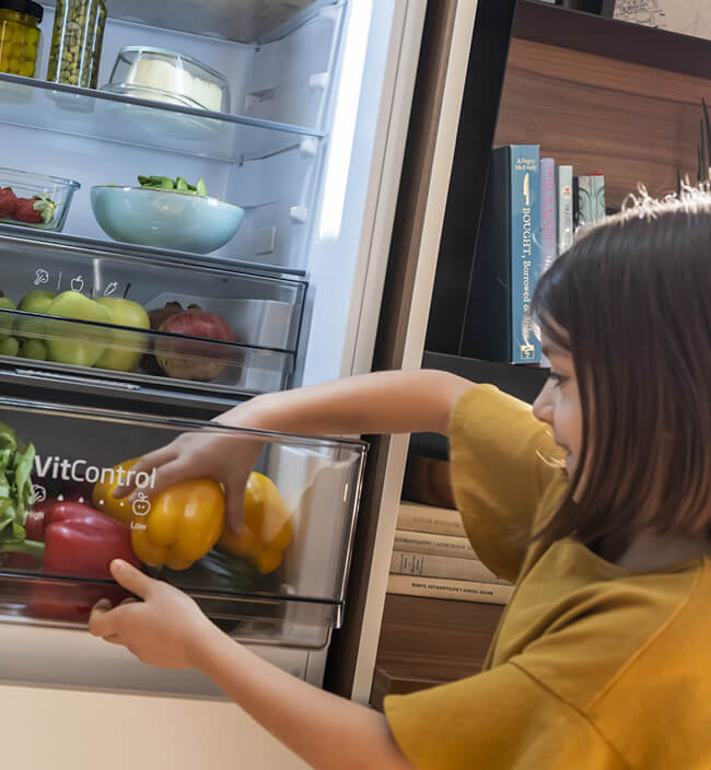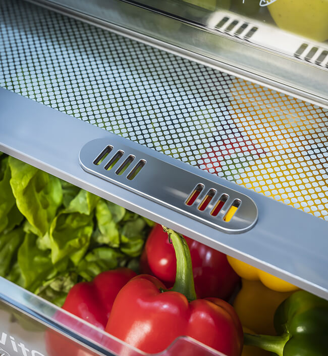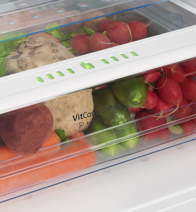 Převezměte kontrolu nad vlhkostí v přihrádce VitControl Plus. Stačí jeden pohyb posuvníku. Přesuňte ho vlevo, abyste se mohli co nejdéle těšit ze šťavnatosti svého oblíbeného ovoce. Přesuňte ho vpravo, aby se ve zvýšené vlhkosti déle uchovala křupavost a svěžest zeleniny.