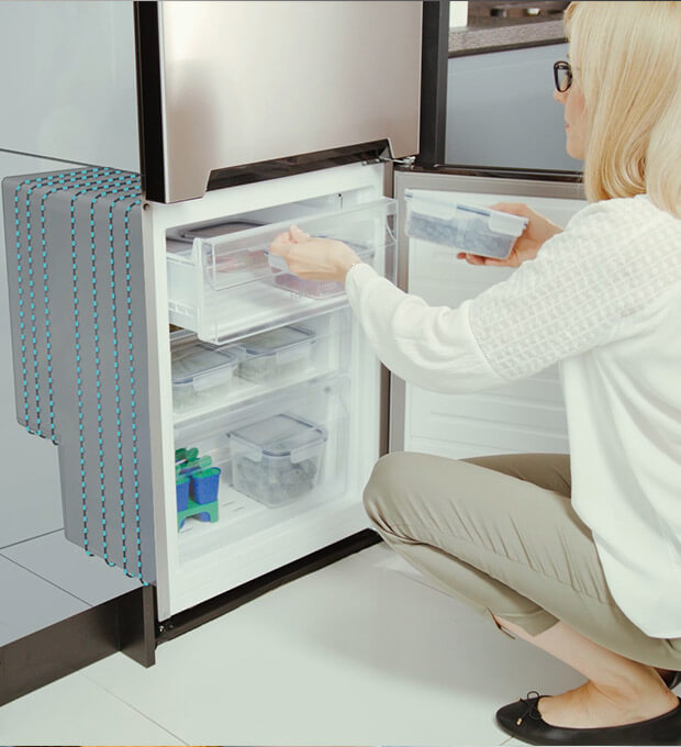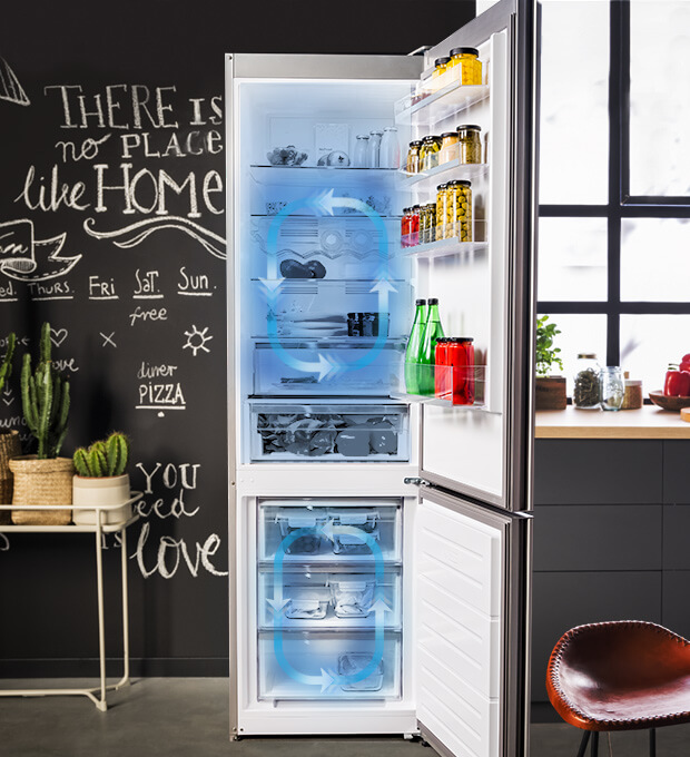 Díky stálé cirkulaci chladného vzduchu panuje na každé polici uvnitř chladničky stejná teplota. Stálá kontrola úrovně vlhkosti také umožňuje minimalizovat riziko rozvoje bakterií a uchovat potraviny déle čerstvé.