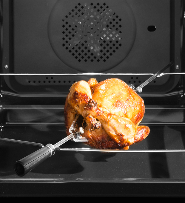 Výjimečný prvek vybavení, který umožňuje přípravu křupavých a propečených jídel. Obzvláště se hodí při pečení drůbeže. Nejlepšího efektu dosáhneme, když použijeme zároveň rožeň, opékač a horní topné těleso.