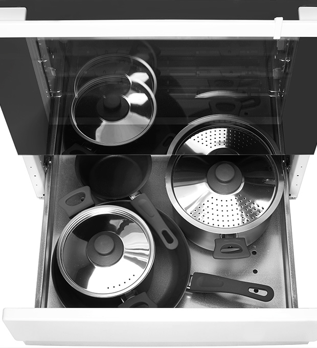 Pod komorou trouby se nachází prostor na nádobí, pánve a hrnce. Šuplík je posazen na kolečkovém výsuvu, který zajišťuje stabilní tichou činnost. Díky moderním syntetickým materiálům je šuplík odolnější vůči vysokým teplotám.